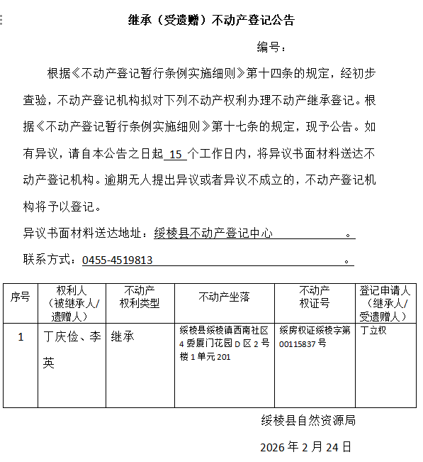 丁庆俭、李英继承(受遗赠)不动产登记公告