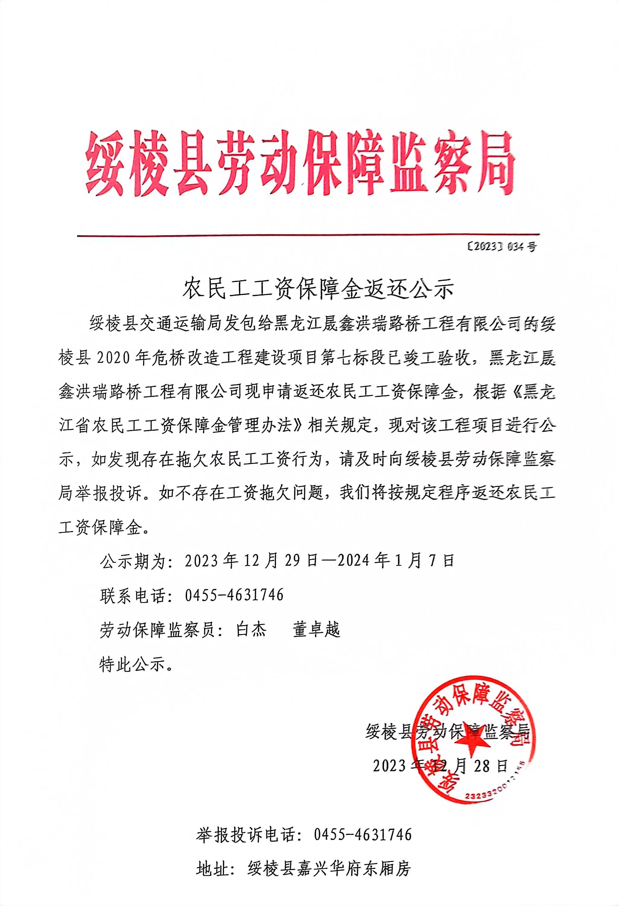农民工工资保障金返还公【2023】034号
