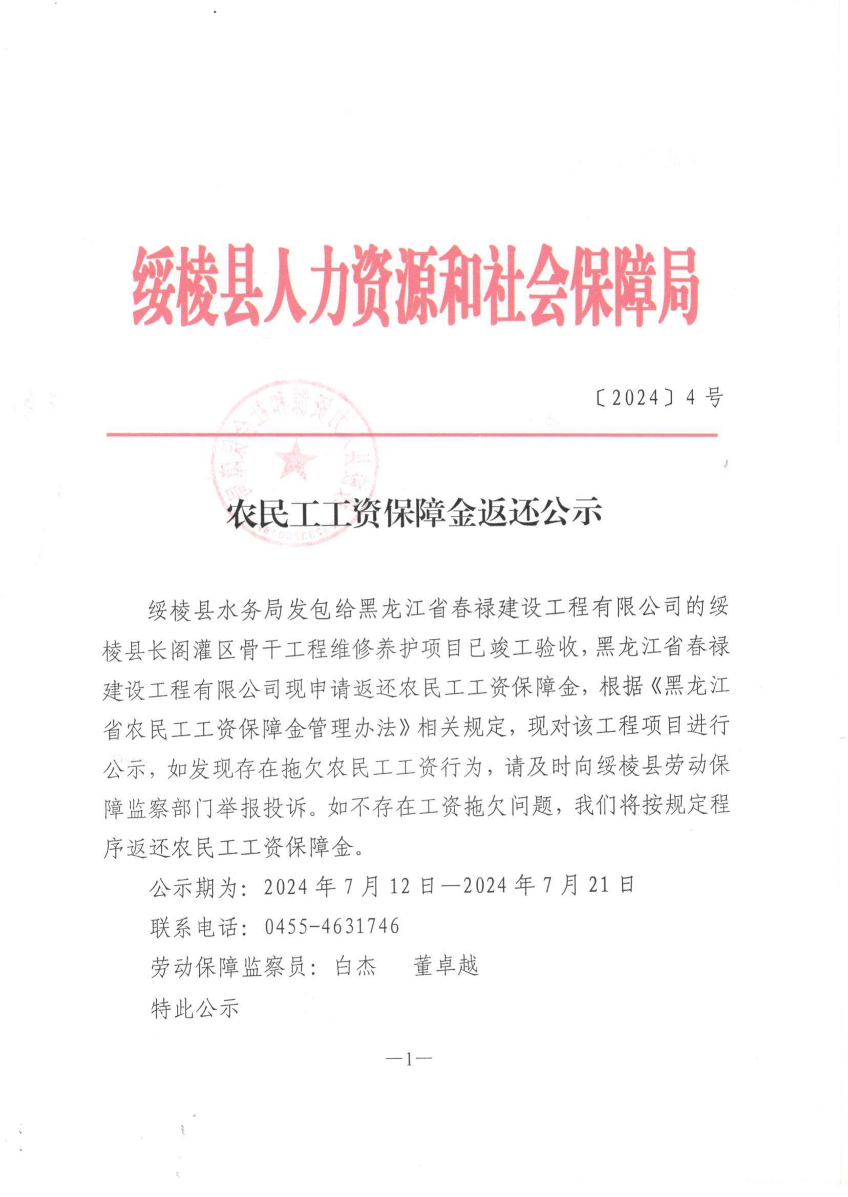 农民工工资保障金返还公示【2024】4号
