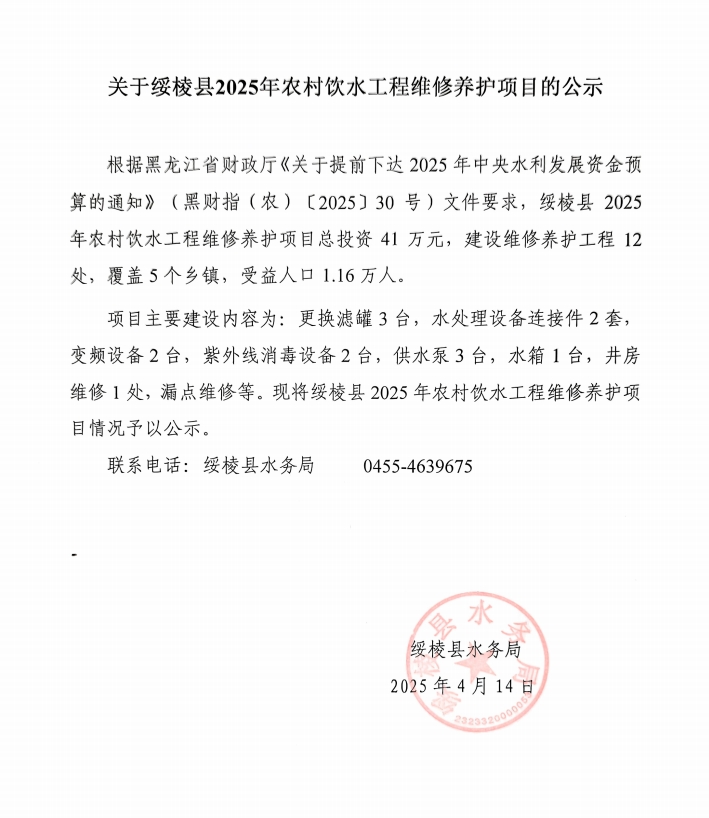 关于绥棱县2025年农村饮用水工程维修养护项目的公示
