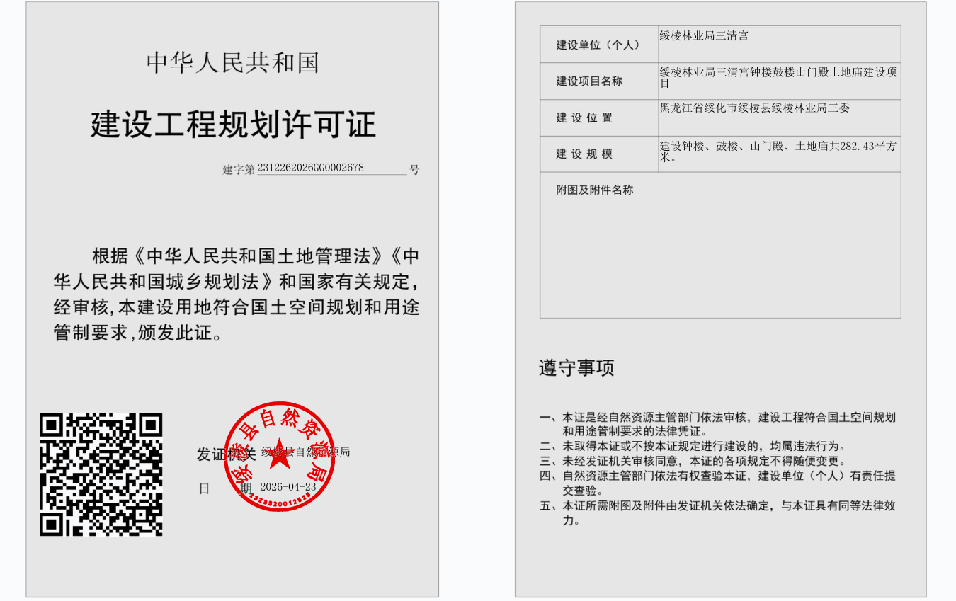 绥棱林业局三清宫钟楼鼓楼山门殿土地庙建设项目建设工程规划许可证